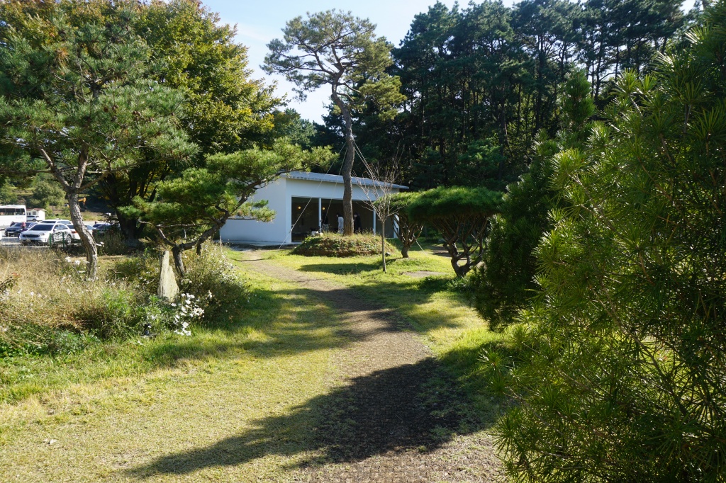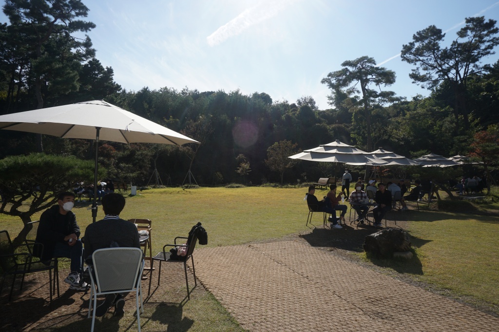본관 뒤편에 야외에서 차를 마실수 있게 테이블들이 있어서 날씨가 좋은 봄, 가을에는 야외에서 커피를 즐길 수 있습니다.