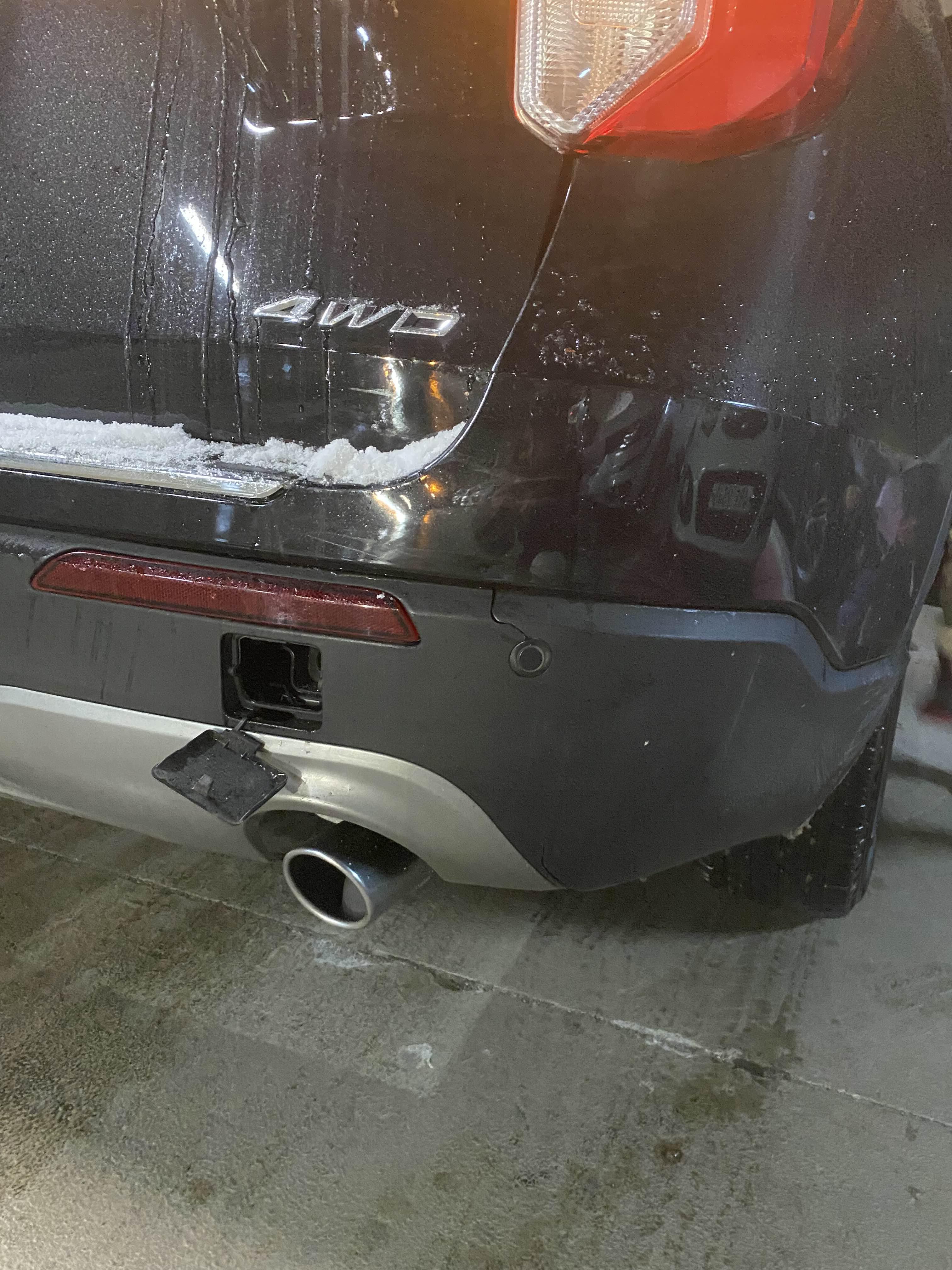 뒤에 아랫범퍼가 깨지고 센서부분이 빠졌습니다. 그리고 뒤 상부 범퍼는 양쪽이 살짝 뒤틀렸습니다.