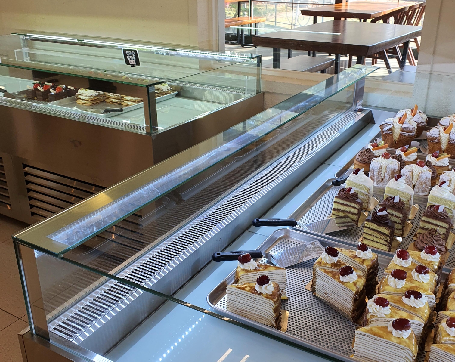 팡도르 초코케익 생크림케익등 케익 매대가 있고 이 집의 시그니처 크레이프 조각 케이크가 보입니다.