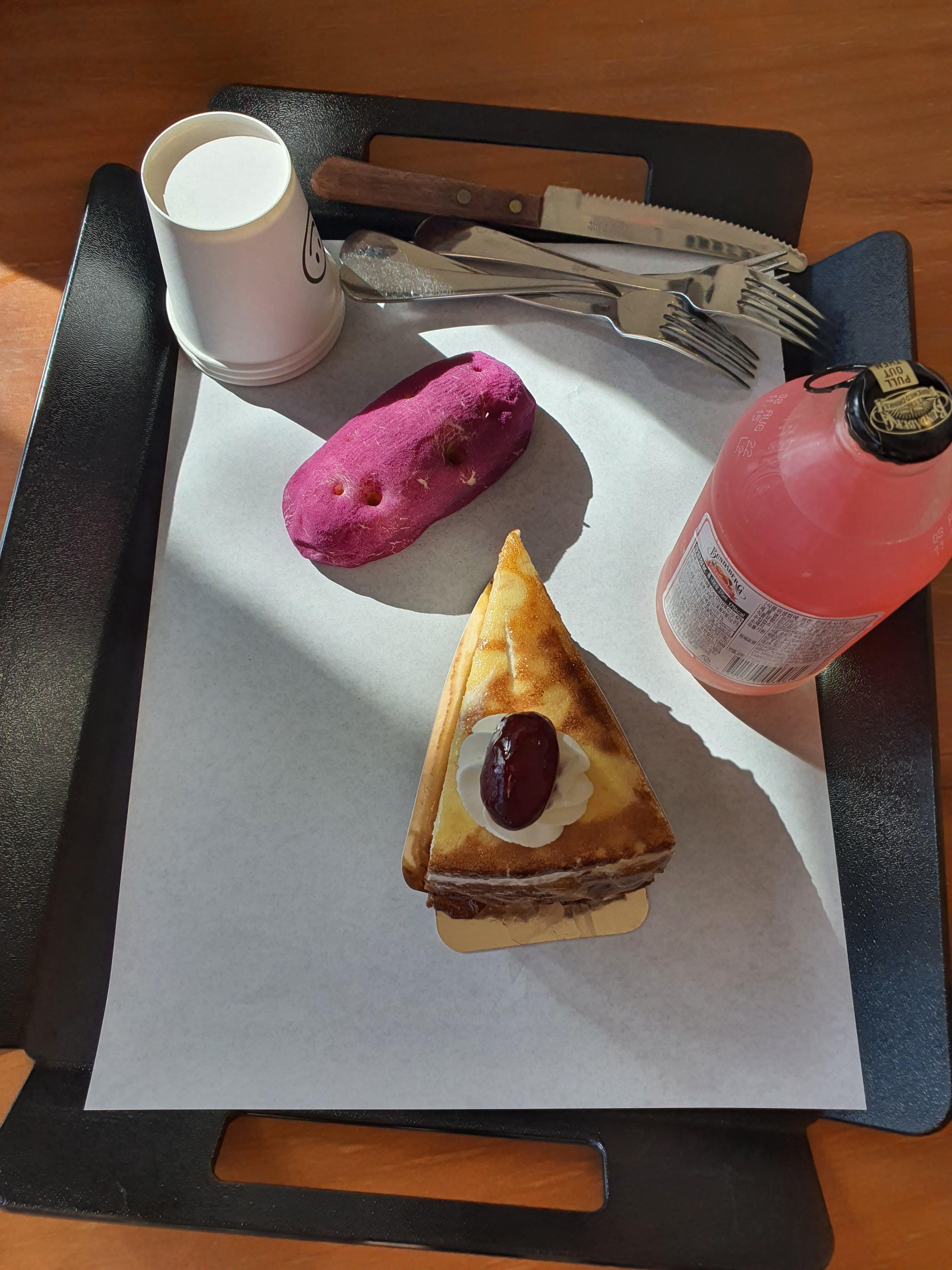 아메리카노, 분다버그 음료, 크레이프 케이크 한 조각, 고구마빵을 골라봤습니다.