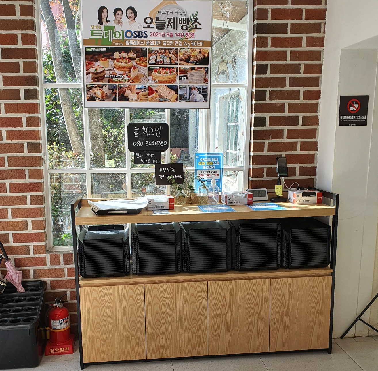 요즘 필수인 방문자 체크인을 하고 빵을 담을 쟁반과 장갑을 낍니다.