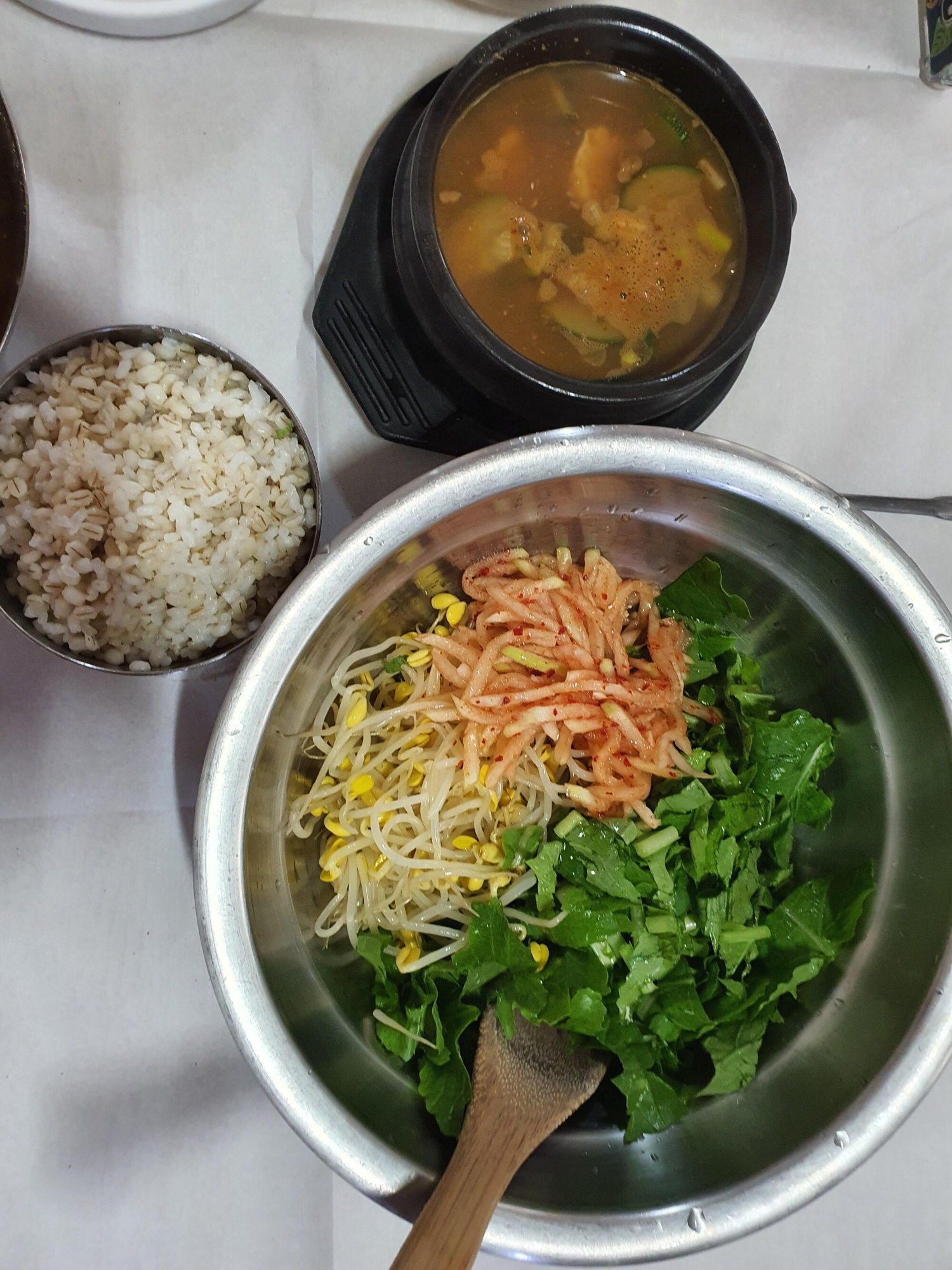 집된장이 구수한 맛이 나는 된장찌개와 보리비빕밥입니다.