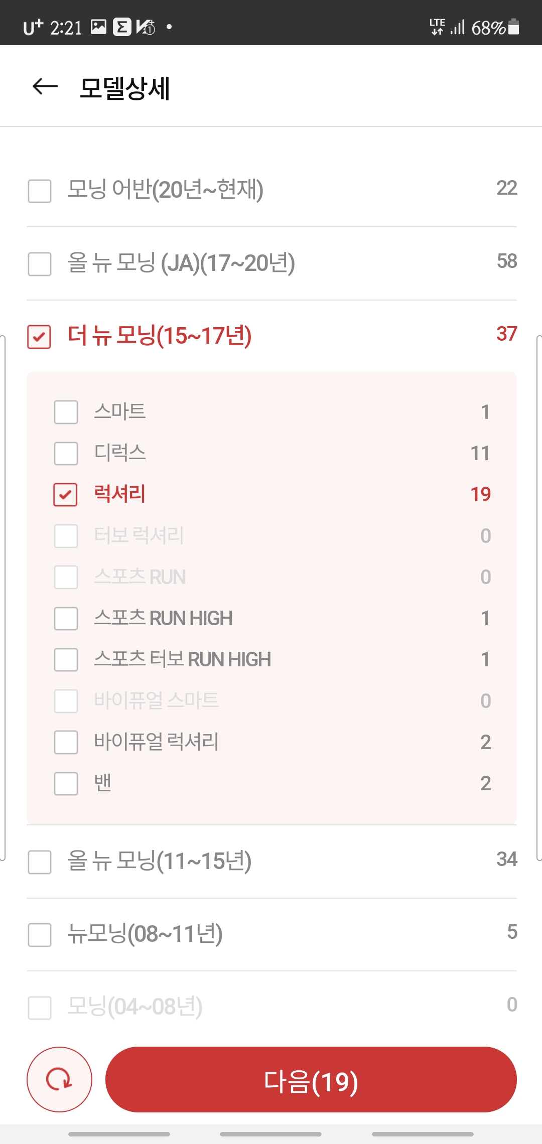 저희는 더뉴모닝을 구매할거기 때문에 모닝을 검색한 후 모델상세에서 원하는 모델을 고릅니다.