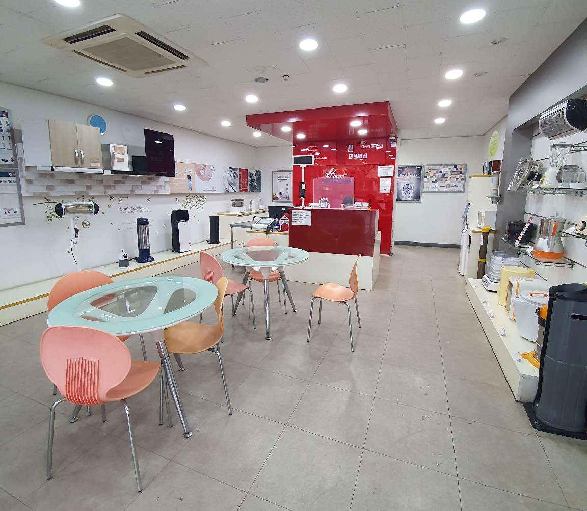 한일전자제품 모델들이 전시 되어있고, 가운데 접수하는 곳이 있습니다.