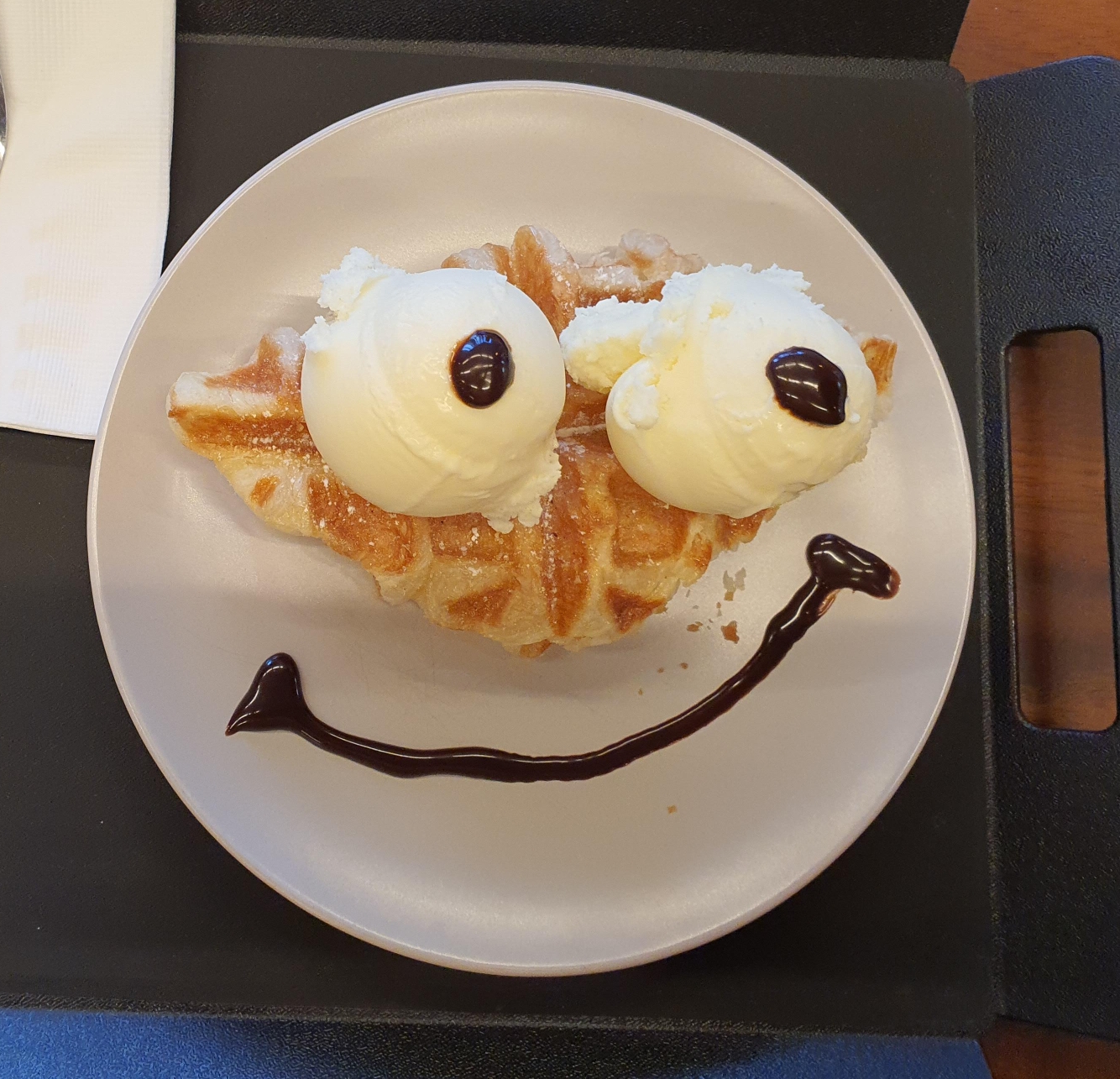 따뜻하고 고소바삭한 크로플과 바닐라아이스크림의 조합이 좋습니다.