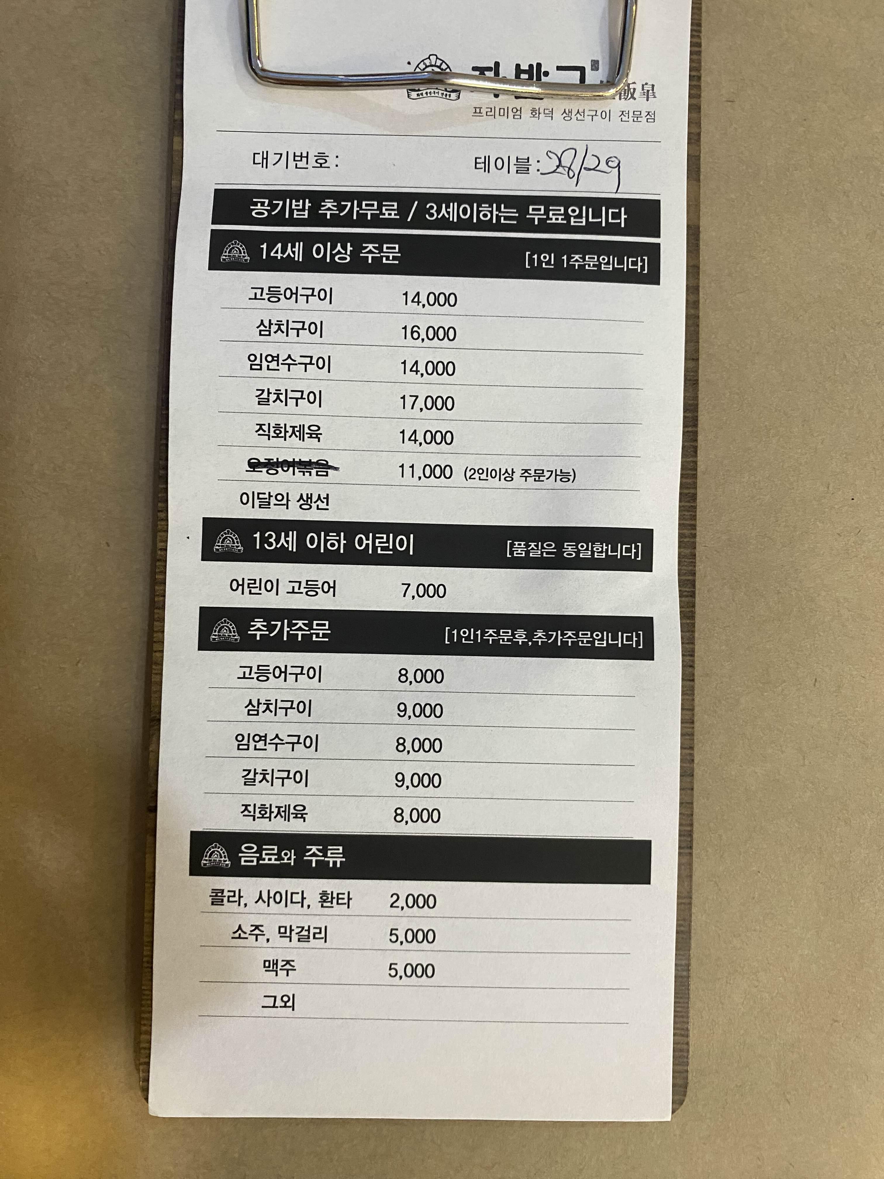고등어 구이, 임연수 구이, 직화 제육2, 어린이 고등어를 주문했습니다.