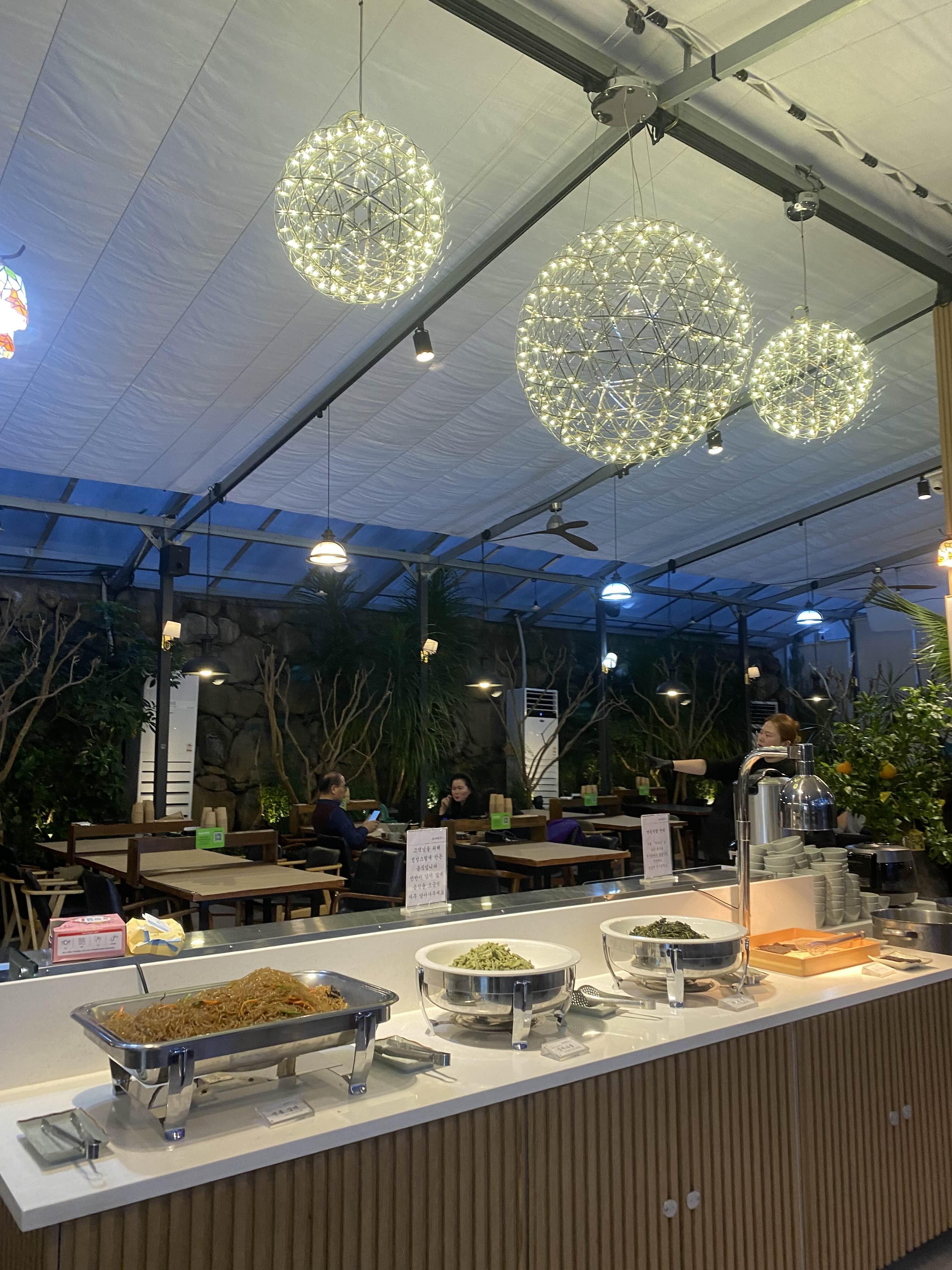 가운데 반찬을 자유롭게 먹을수 있게 뷔페식으로 음식이 놓여 있습니다.