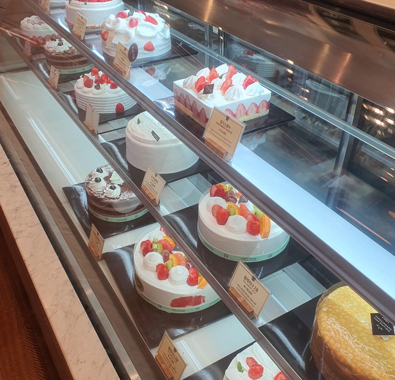 성심당 케익들이 보입니다. 딸기케익, 초코케익, 크레이프케익들이 있습니다.