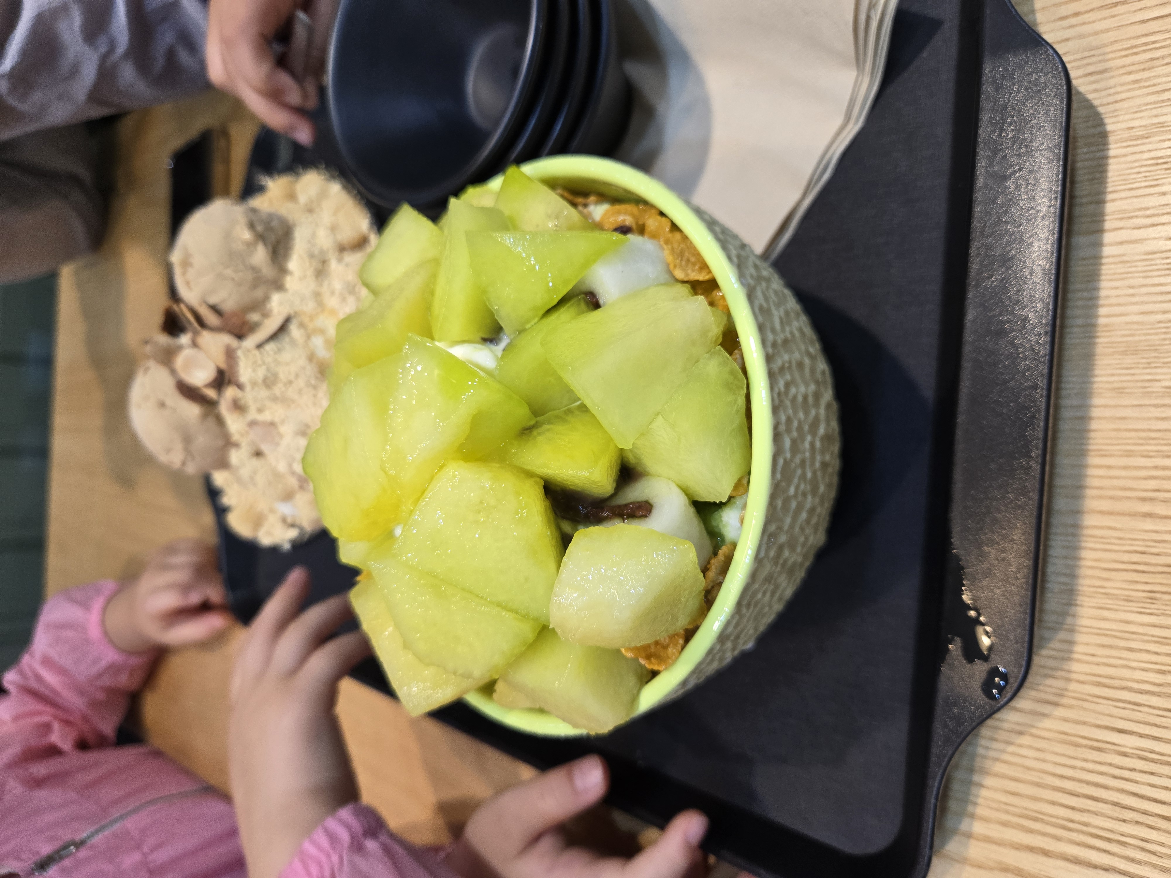 증간에 멜론 시럽이 듬뿍있어 위에 한번 퍼먹어도 밑에 시럽이있어 단맛은 쭉 이어집니다.