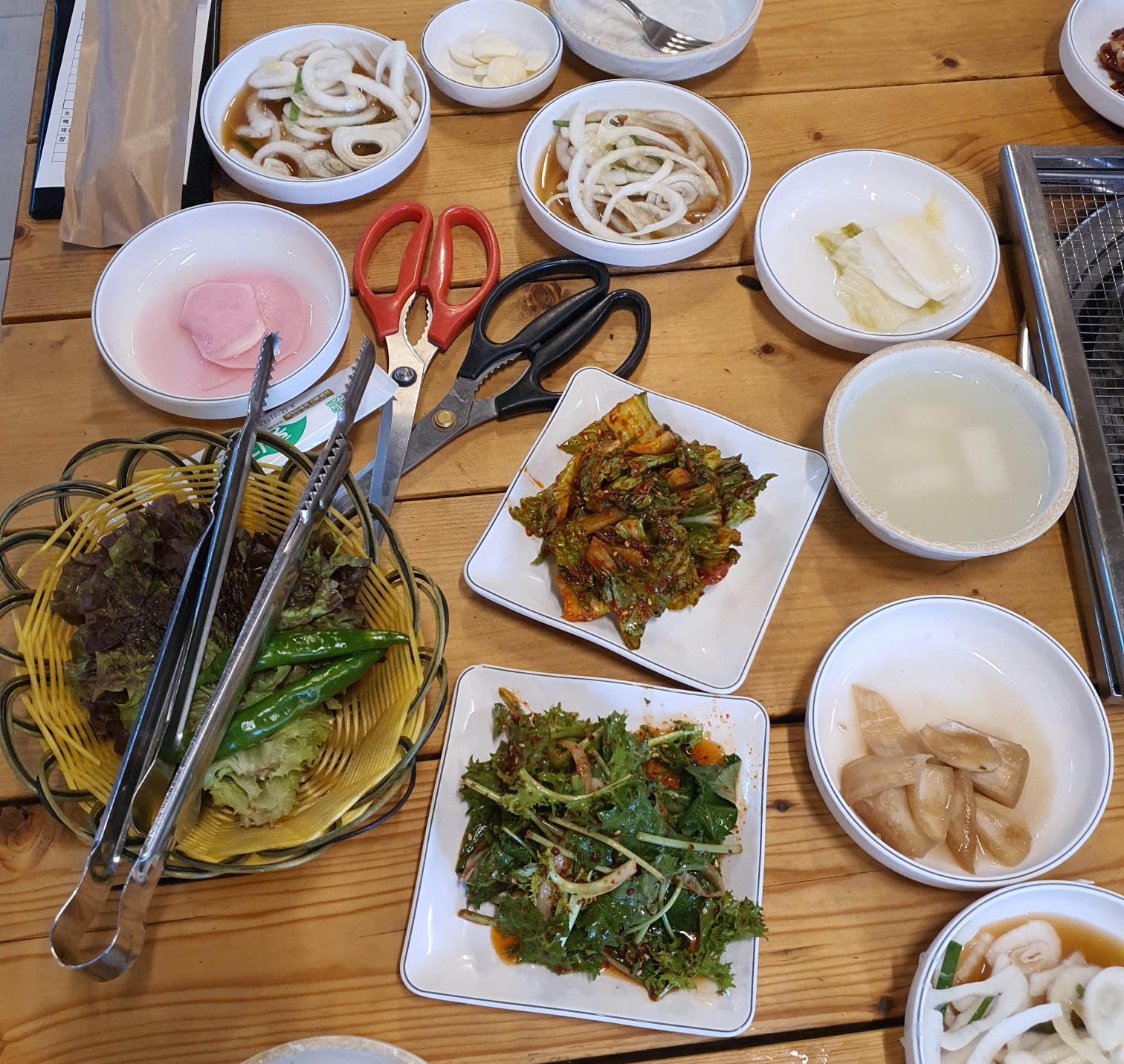 고기와 곁들어 먹을 양파절이와 반찬으로는 봄동 겉절이, 참나물 무침, 양파장아치, 백김치, 동치미, 쌈무가 나옵니다.