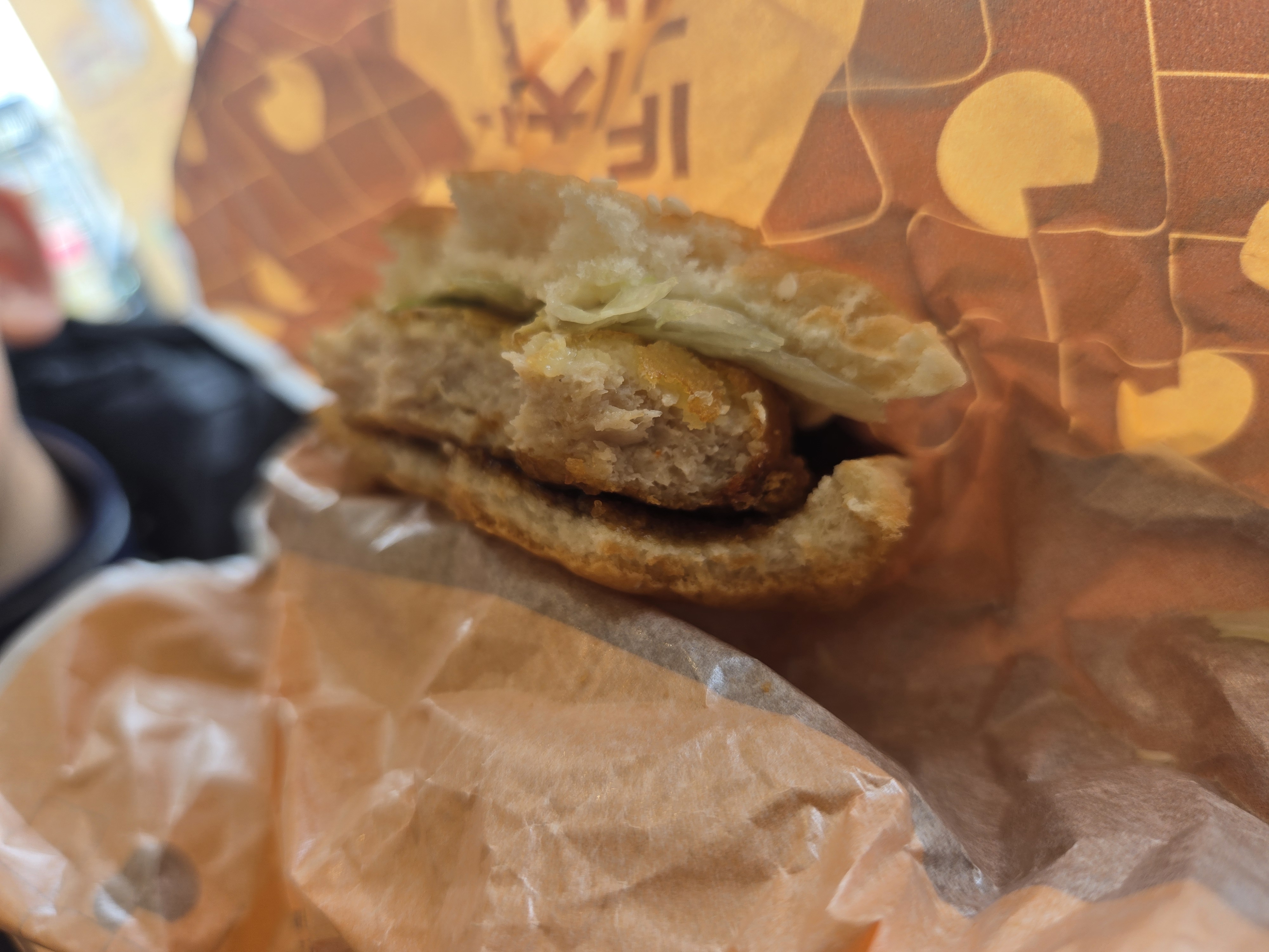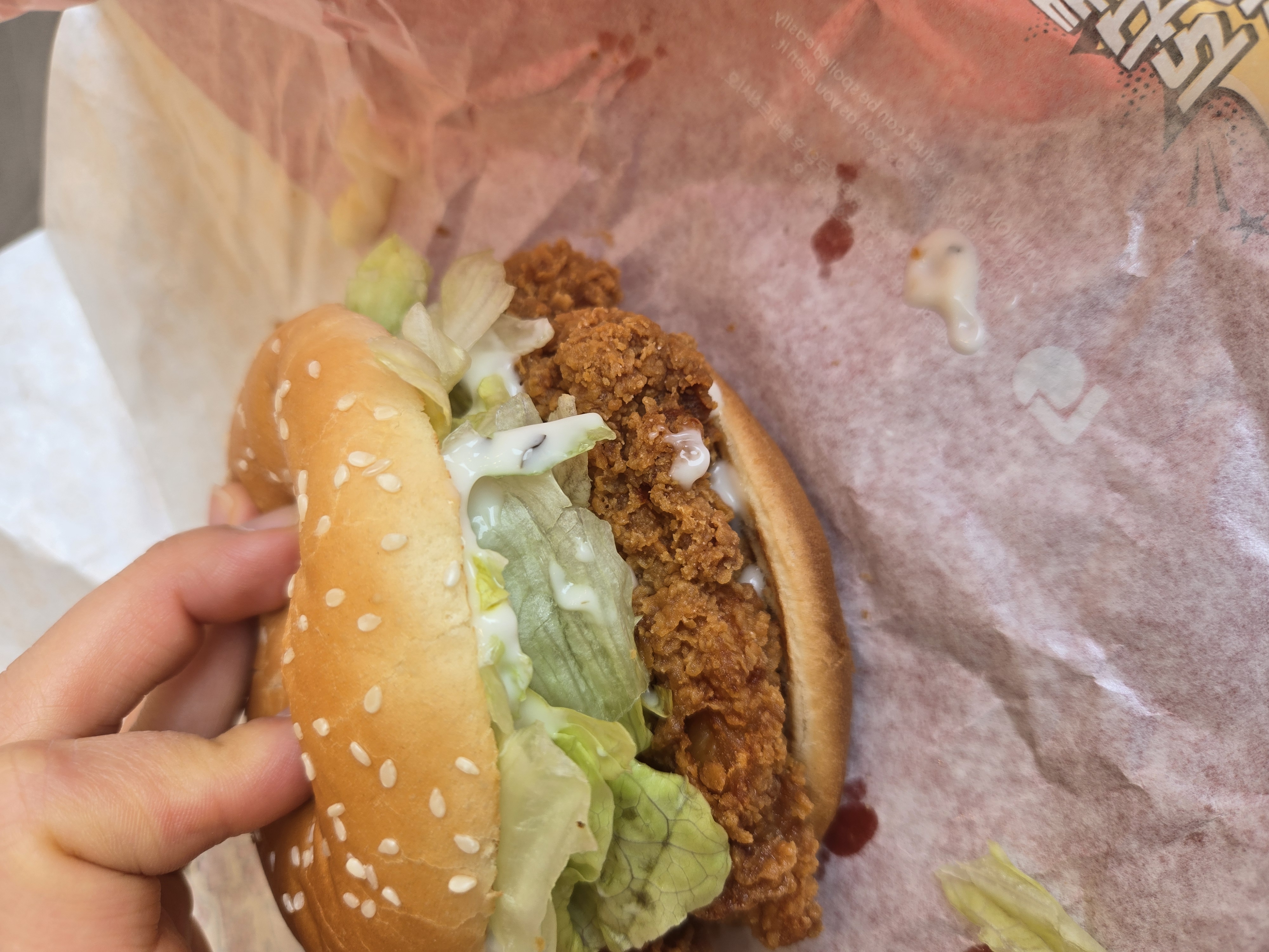 옆에 친구가 시킨 일반 치킨버거랑 한 입씩 바꿔 먹어봤습니다 와... 차이가 확 납니다. 기존 치킨버거는 그냥 데리야키 소스에 익숙한 치킨 너겟 끼워 넣은 느낌이라면, 이번 신상은 진짜 '요리'를 버거 사이에 끼워둔 느낌?