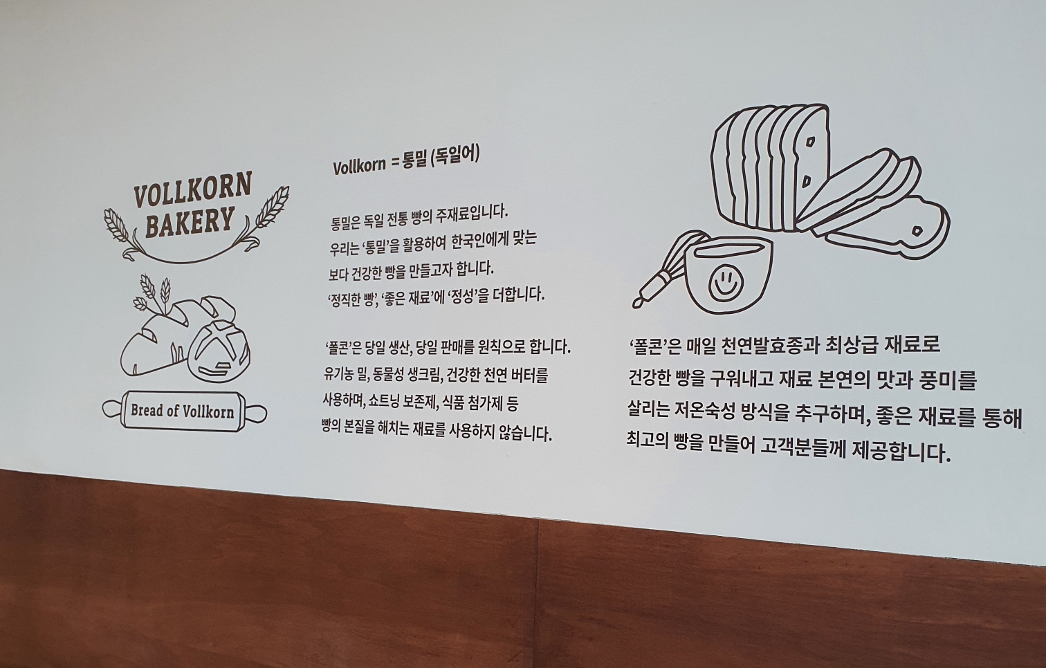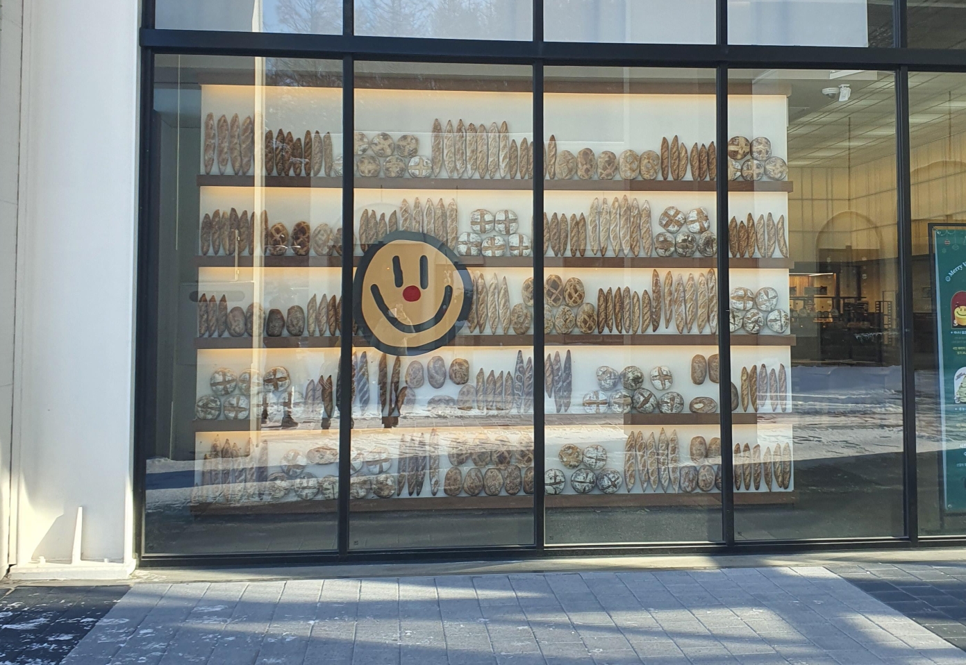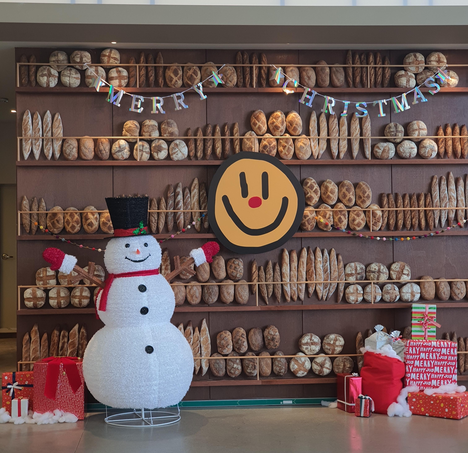 메장 벽한편에 빵이 데코레이션으로 진열되어 있고 크리스마스 장식 포토존이 있습니다.
