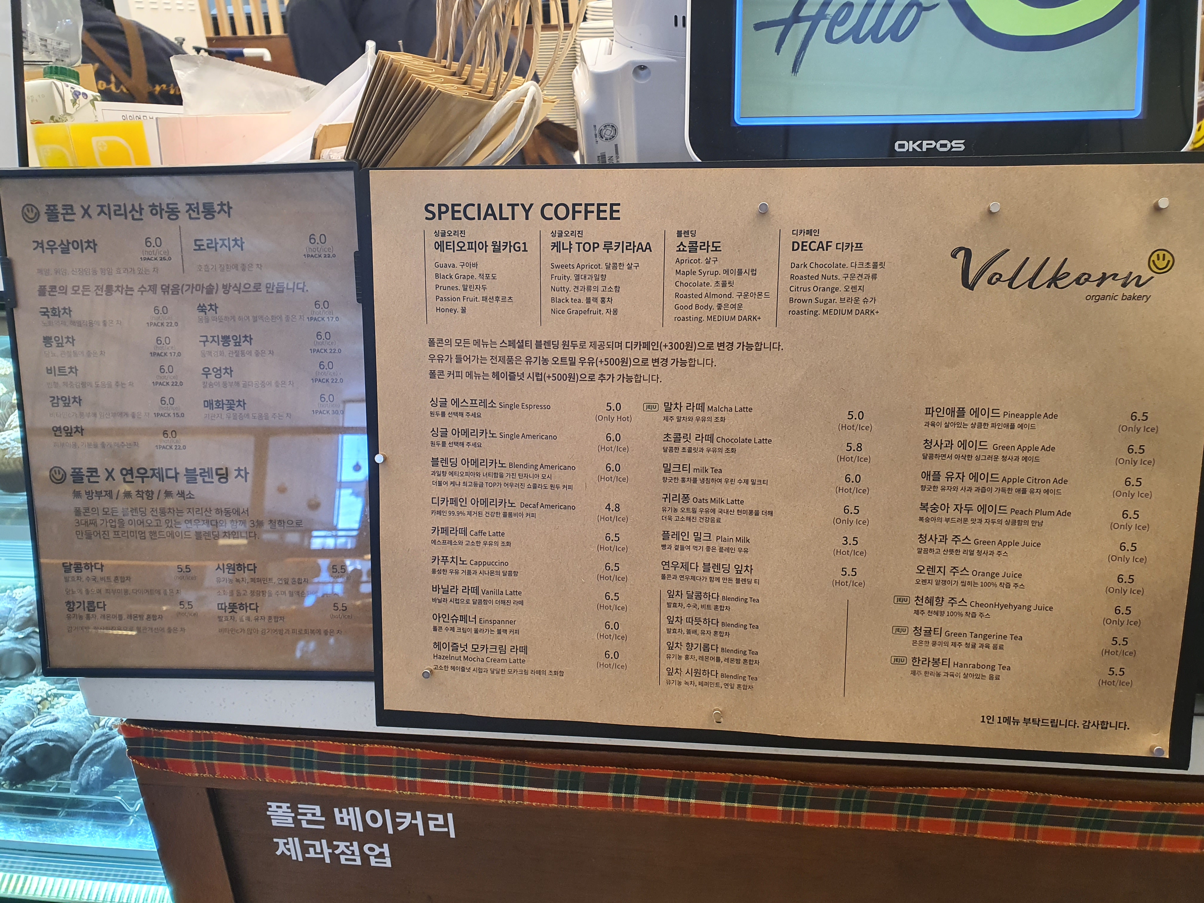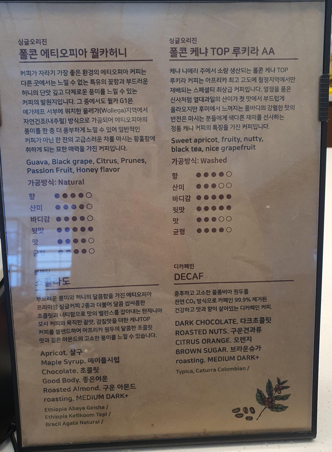 폴콘에서는 원두도 볶고 블랜딩도 하나 봅니다. 싱글 오리진으로 에티오피아 뮐카G1이 있고 케냐 TOP루키라 AA가 있습니다. 우리는 블랜딩아메리카노를 먹어 보았습니다.