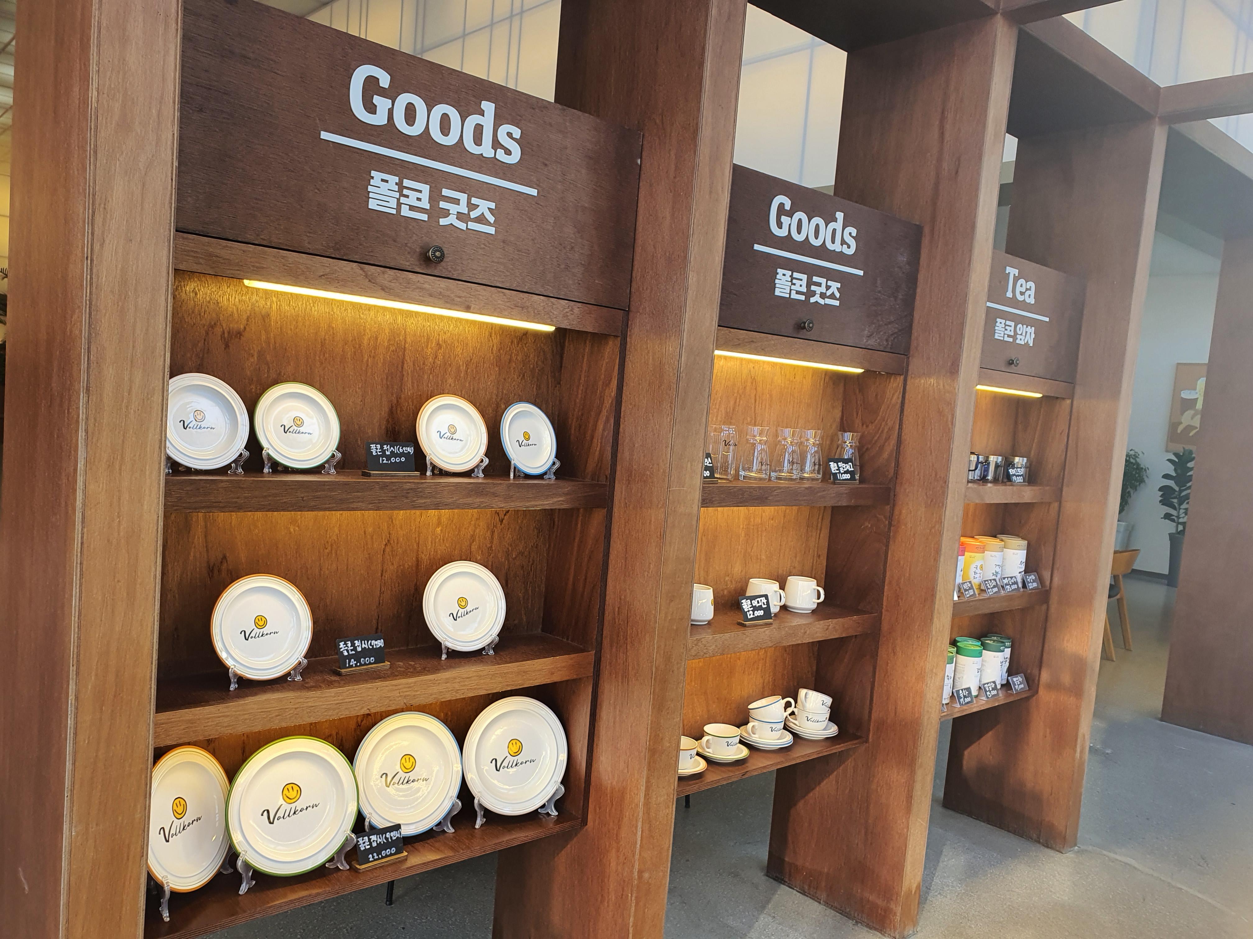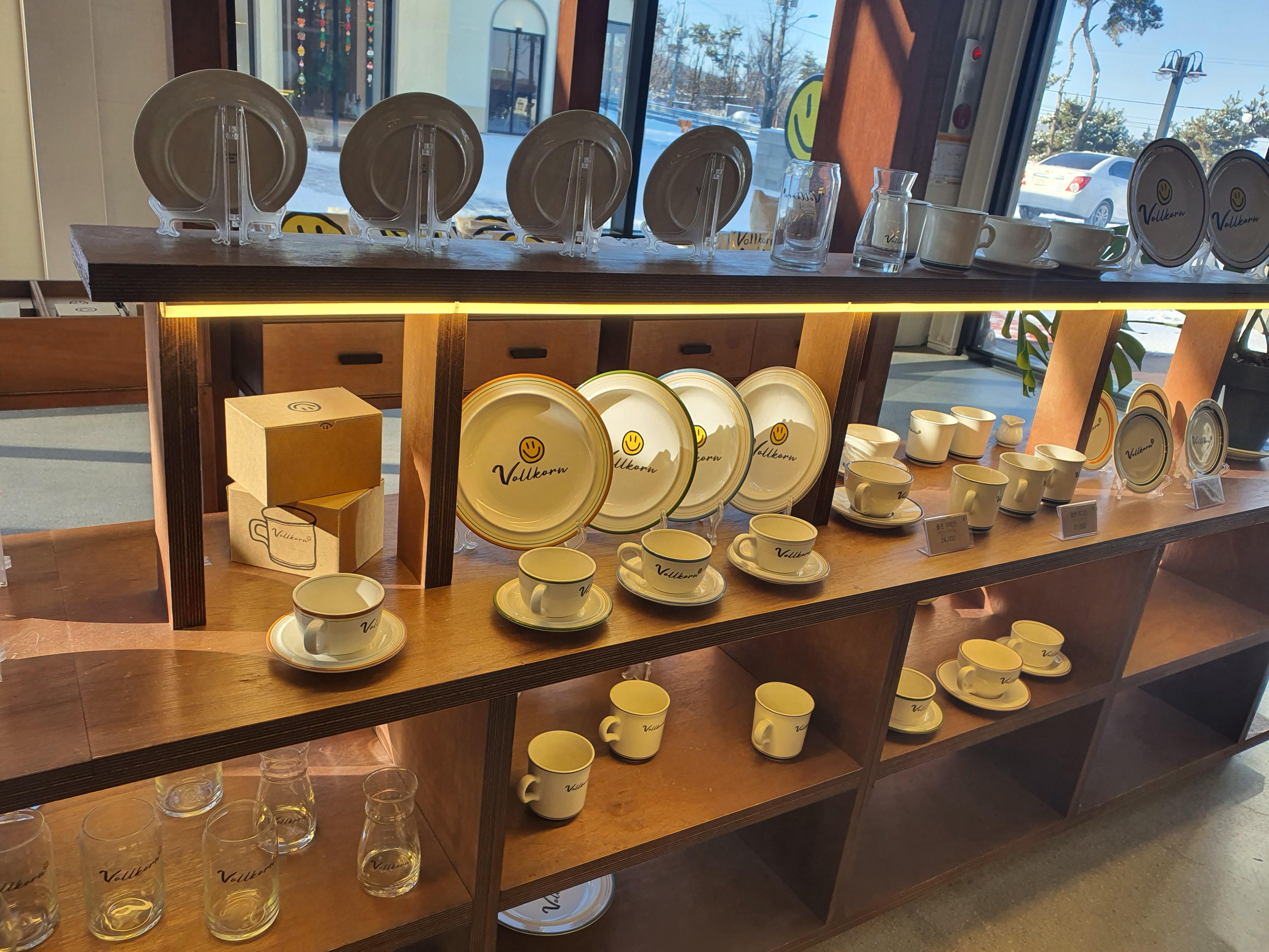 빵매대에는 빵이 진열되어 있고 그 위에는 폴콘의 접시들이 놓여 있습니다.