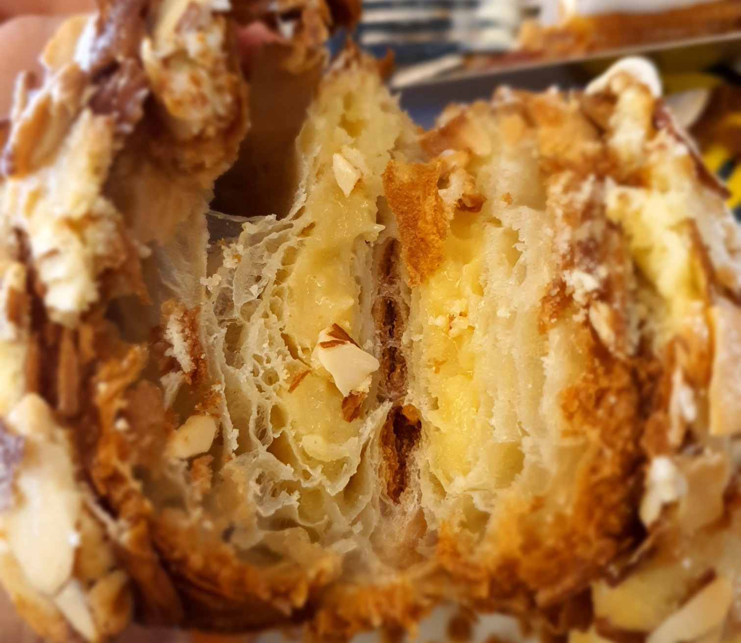 어제만들어 놓은 크로와상같은 느낌.. 반으로 쪼갰을떄 바사삭하면서 깨지는 느낌이 없었습니다. 겉의 바삭한 아몬드는 많아서 아몬드 식감이 좋았습니다. 달기정도는 좋았습니다. 많이 달지 않았습니다.