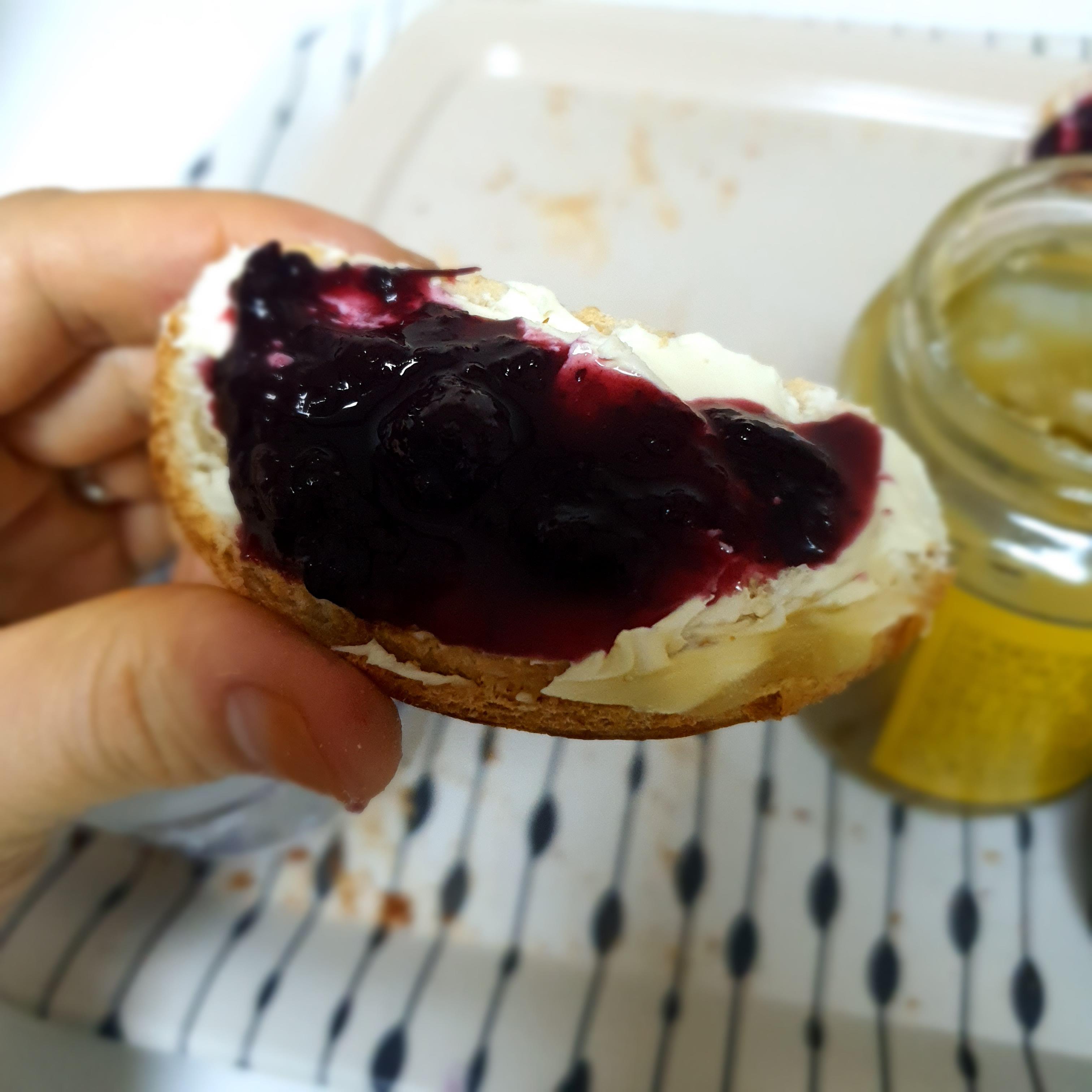 크림치즈를 바르고 집에서 만든 홈메이드 블루베리 콩포드와 먹어봅니다.