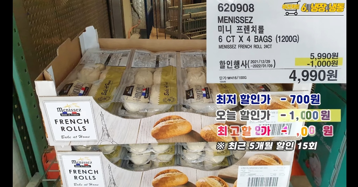 냉동생지프렌치롤은 한봉당 6개가 들어있고 총 4봉지를 묶어팝니다. 6천원도 안하는 가격이고 할인을 하면 5천원도 안하는 저렴한 가격으로 인기가 있습니다.