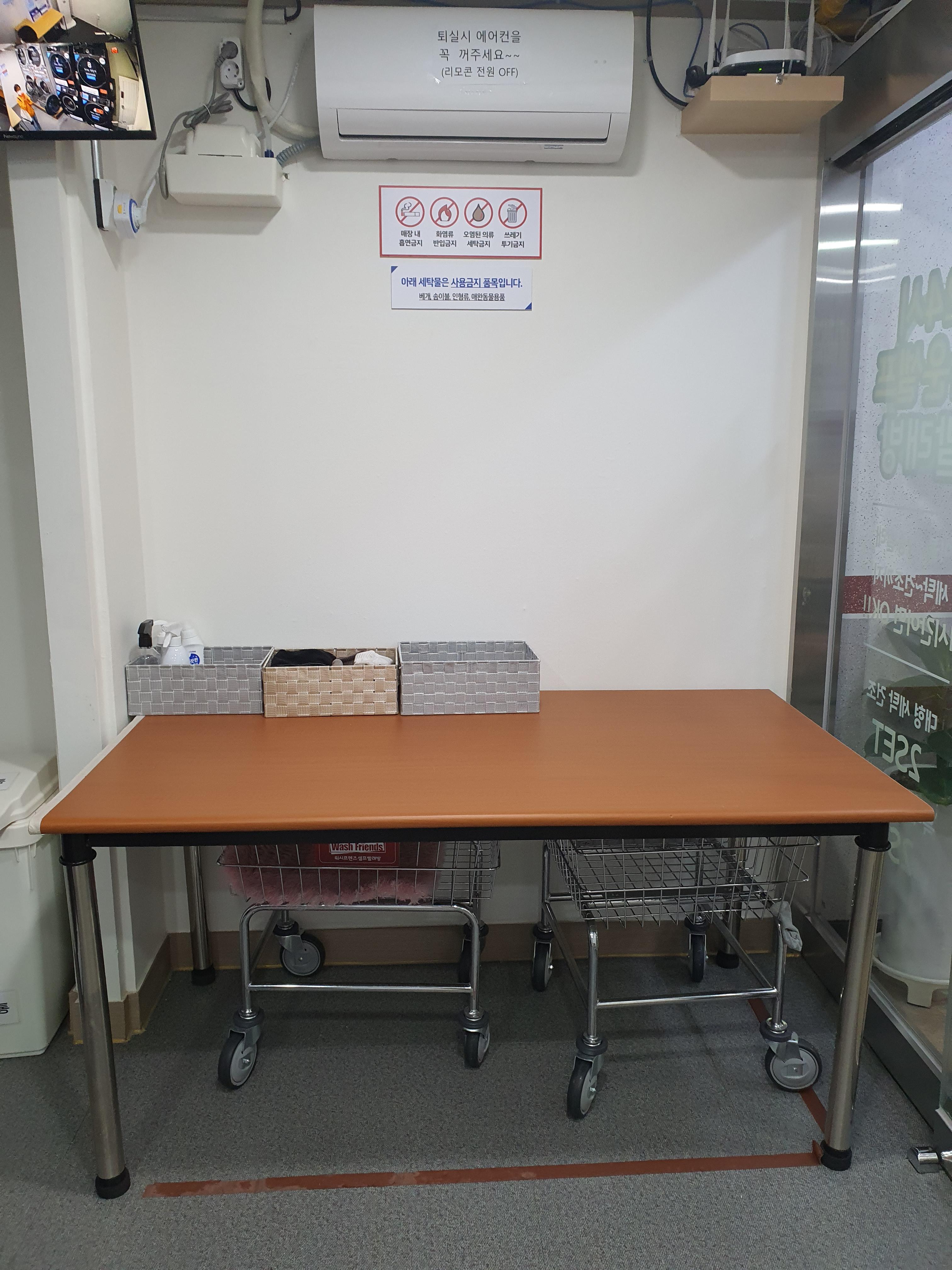 셀프빨래방 입구로 들어오면 바로 빨래 정리대가 있고요. 그 옆에는 건조기 4대 세탁기 4대가 있습니다.