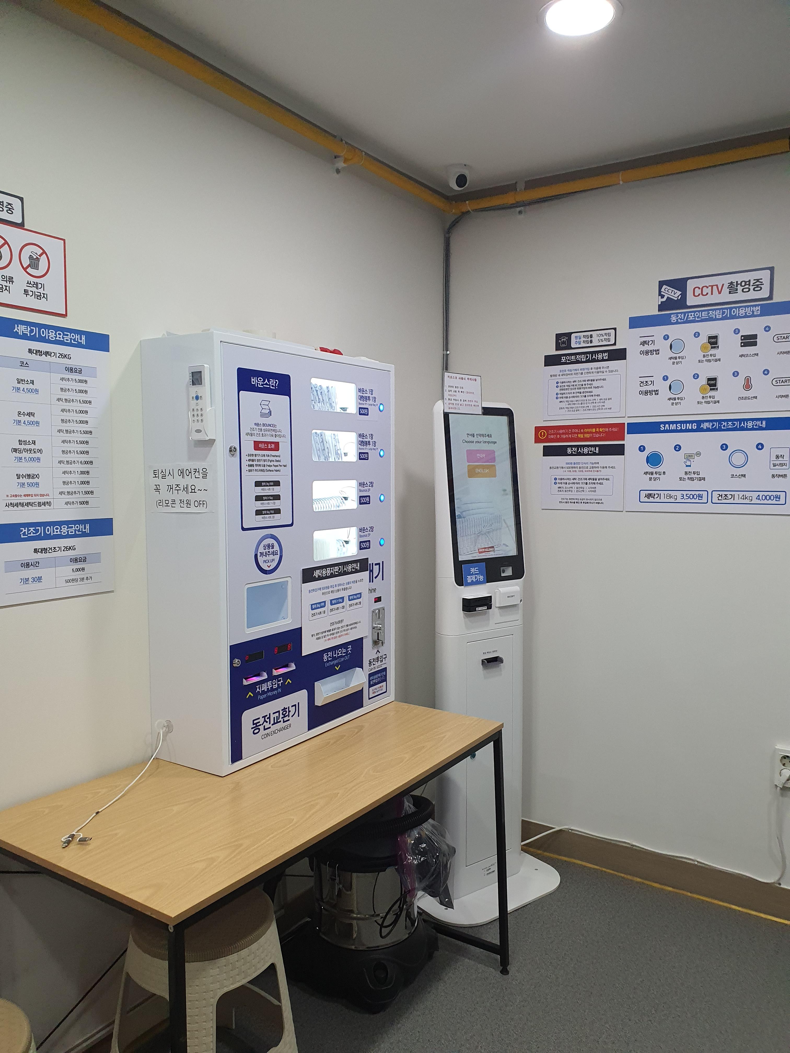 세탁기 앞에는 회원 키오스크와 동전교환기 겸 건조기 세제 자판기가 있습니다.