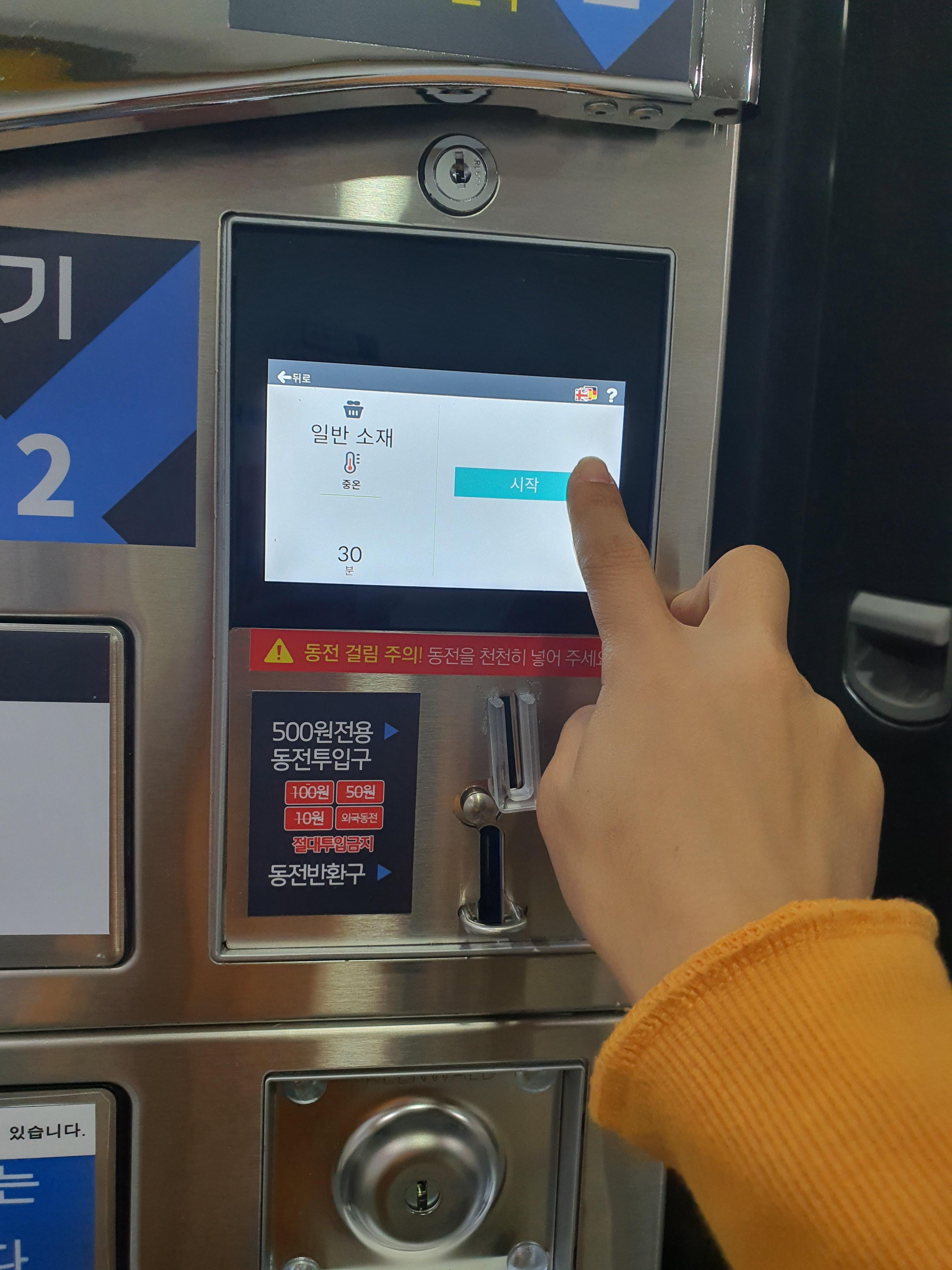 먼저 세탁코스를 선택하여 동전을 넣어주고 -> 세탁이나 헹굼을 +-로 선택하여 추가하시고 (저는 기본 세탁이어서 이세팅을 건너뛰었습니다.) 다음을 누르고 -> 시작 버튼을 누르면 가동