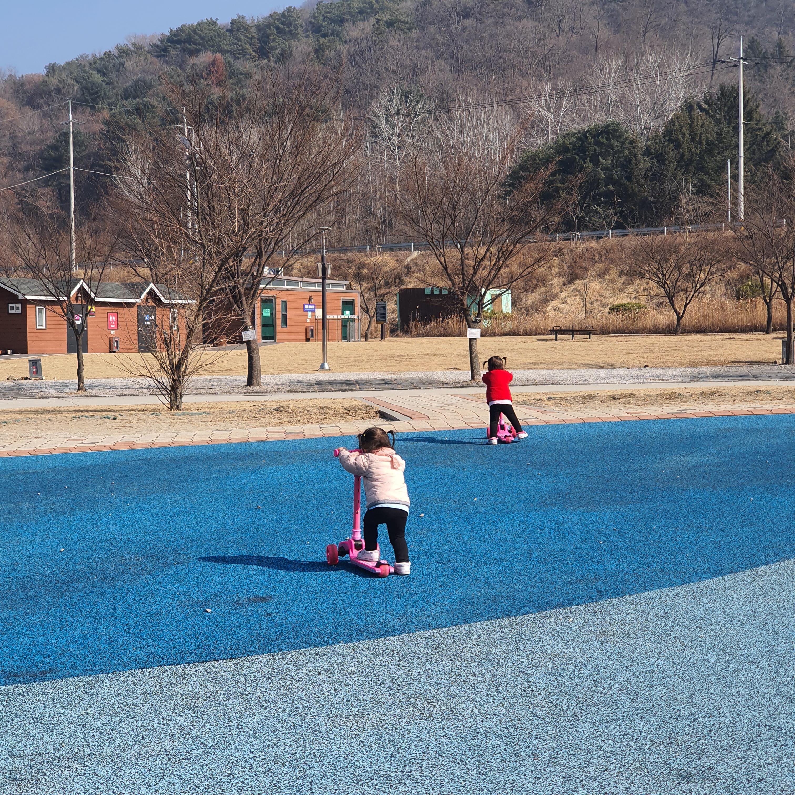 주말에 다녀온 인적 드문 공원에서 킥보드 타는 우리 둥이들.