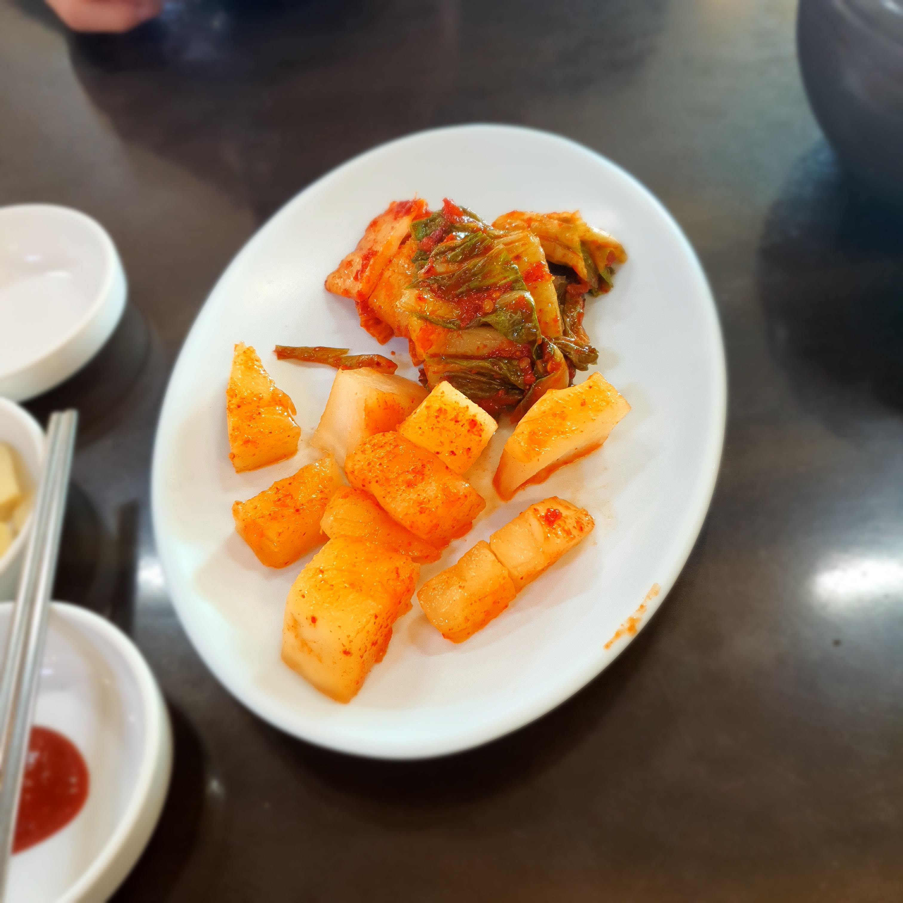 김치와 무섞박지입니다. 이 김치가 정말 국밥에 어울리는 맛입니다. 살짝 달고, 약간 맵콤하고 짜지 않아 정말 맛있습니다. (김치를 따로 팔고 있더군요.)